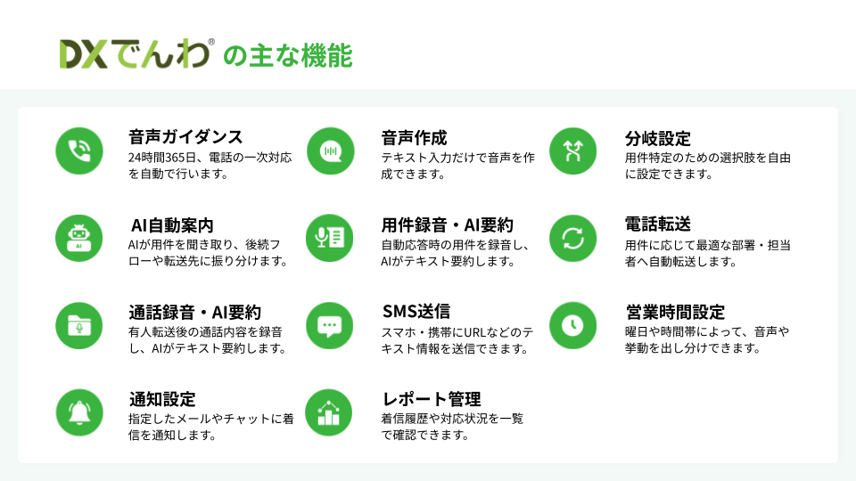 24時間365日の「音声案内による自動受付」「用件に応じた担当者への振り分け」を実現するほか、電話相手が吹き込んだ内容をAIが要約して文字に起こす「音声自動テキスト化機能」、音声のみに頼らない自動応答を可能にする「SMS送信機能」など、多様な機能を標準搭載しています。