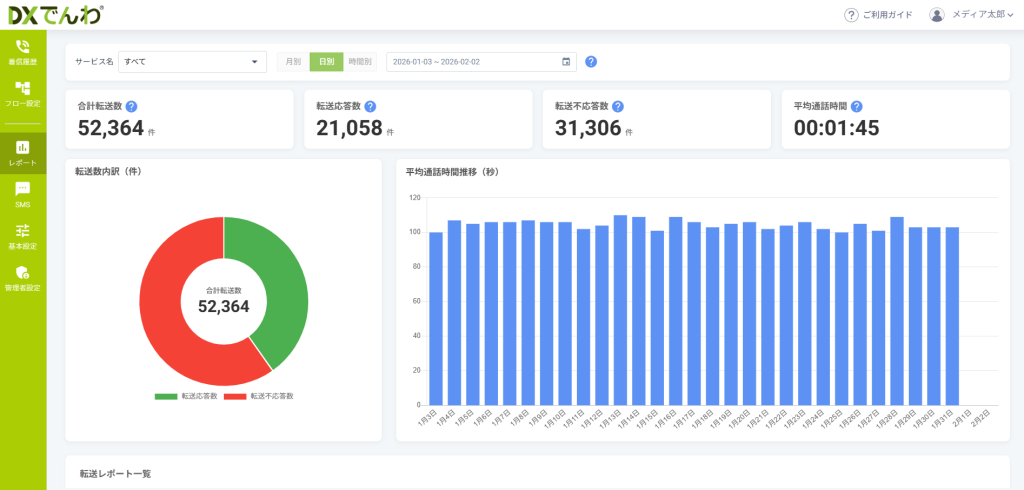 - 平均通話時間:転送先への接続完了後から通話終了までの平均通話時間