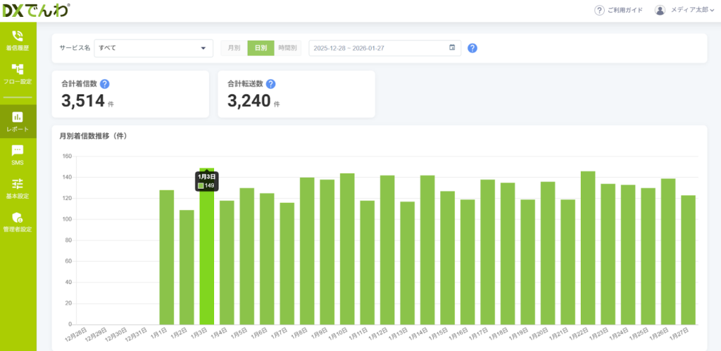 「月別 / 日別 / 時間別」を選択したうえで期間を指定することが可能で、ユーザー画面①のように「合計着信数」の推移がグラフで表示されます。